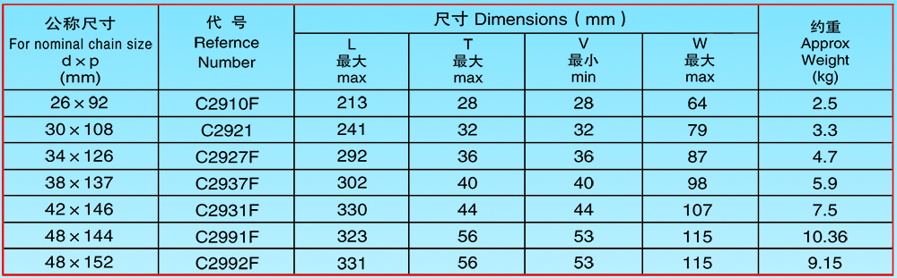 這種接鏈環只可處置使用,其外形大小符合DIN22258 Part3 標準要求,并經精心設計,以確保與配套鏈輪的配合。由于采用較低寬度設計,在同樣大小的傳送槽中,可采用較大截面鏈環,從而提高輸送能力。