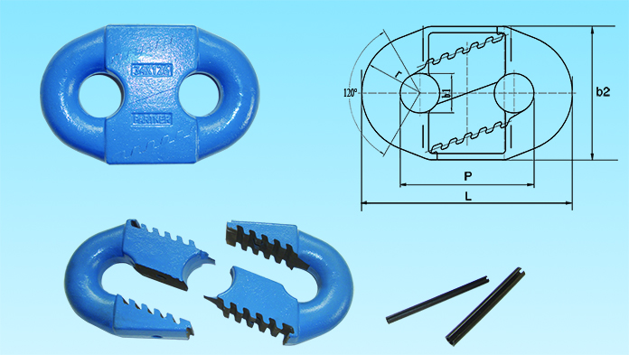 高強度、高耐磨梯齒型接鏈環采用了富含Cr、Ni、Mo原色的高合金鋼制造而成,在可控氣氛多用爐中完成滲透碳熱處理工藝,具有高耐磨(硬度HV800以上,滲碳深度0.1d,有效硬化層深度0.05)、高強度(破斷應力400N/mm以上)、安裝方便(水平和垂直都能使用)的特點,廣泛應用在電廠撈渣機傳統系統上,并可提供常規熱處理的通用型接鏈環。高強度、高耐磨梯齒型接鏈環中環外形尺寸符合DIN22258 Part1 和 MT/T99標準要求。