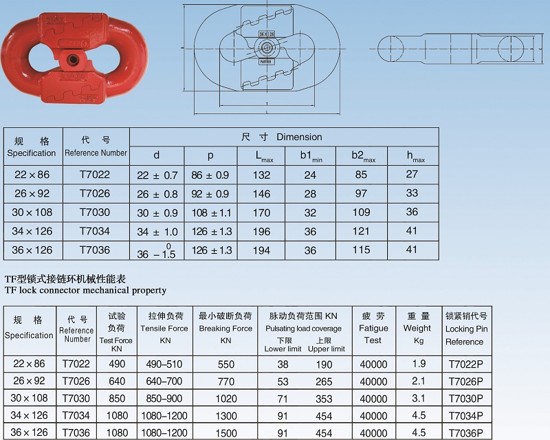 TF接鏈環符合DIN22258 Part1 1983標準,在制造過程中選擇了富含Cr、Ni、Mo合金元素的高合金鋼和多重熱處理工藝,以確保其與配套的鏈輪配合,安全運行,TF環表面經過特殊防腐處理,延長了使用壽命。